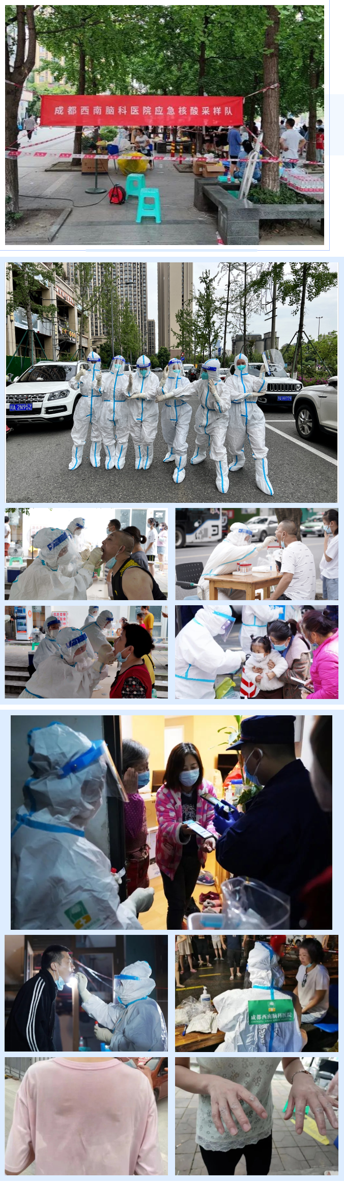 面对反反复复的疫情,我院积极响应区卫生健康局号召,迅速反应,主动参与。在9月2~19日期间,我院分批次共计百余人次全身心投入到全区各核酸采样点工作中,为武侯区时间阻断疫情传播贡献了一份力量。