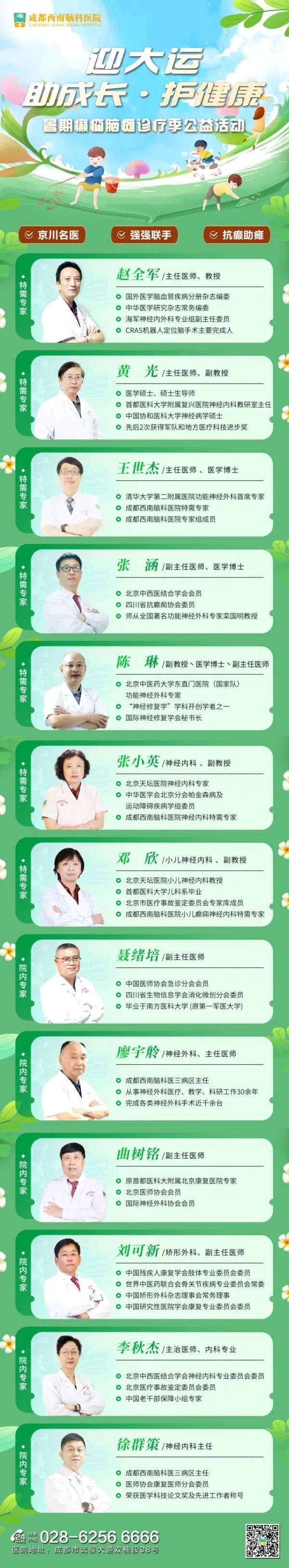 在大运会来临之际,我院联合成都市残疾人福利基金会,开展“迎大运 助成长 护健康”暑期癫痫脑瘫诊疗季公益活动,每周邀请北京脑科医生坐诊,实行单病种限价收费,给予每一位癫痫、脑瘫、发育迟缓的患儿实质性的帮助,用爱心帮扶祖国花朵,用医术助力儿童成长,提高患儿及其家庭对癫痫脑瘫的正确认识,树立治疗的信心,让他们早日摆脱疾病的阴影!