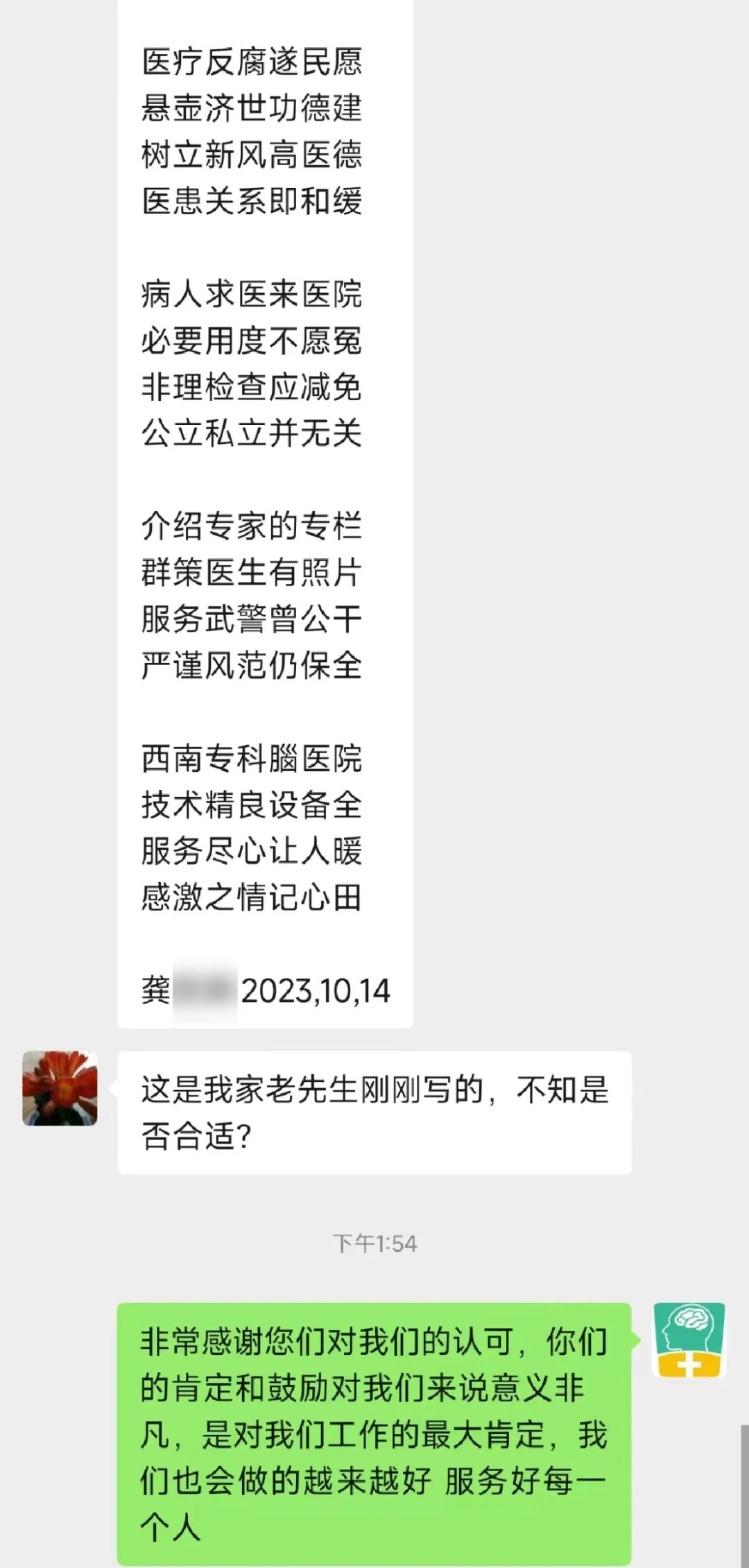 近日,82岁高龄的龚爷爷,因反复头晕伴行走不稳半年多在西南脑科医院三病区住院,诊断为脑动脉硬化、血管狭窄引起的后循环缺血。出院后托子女给我们发来一封感谢诗,字里行间写着对医护人员的感激,对医院医德医风、优质护理的赞扬、感动和认可,传递着双向奔赴的浓浓医患情!这不仅是患者对医护人员的感激和信任,更是对全体医护人员的期望和鼓励。